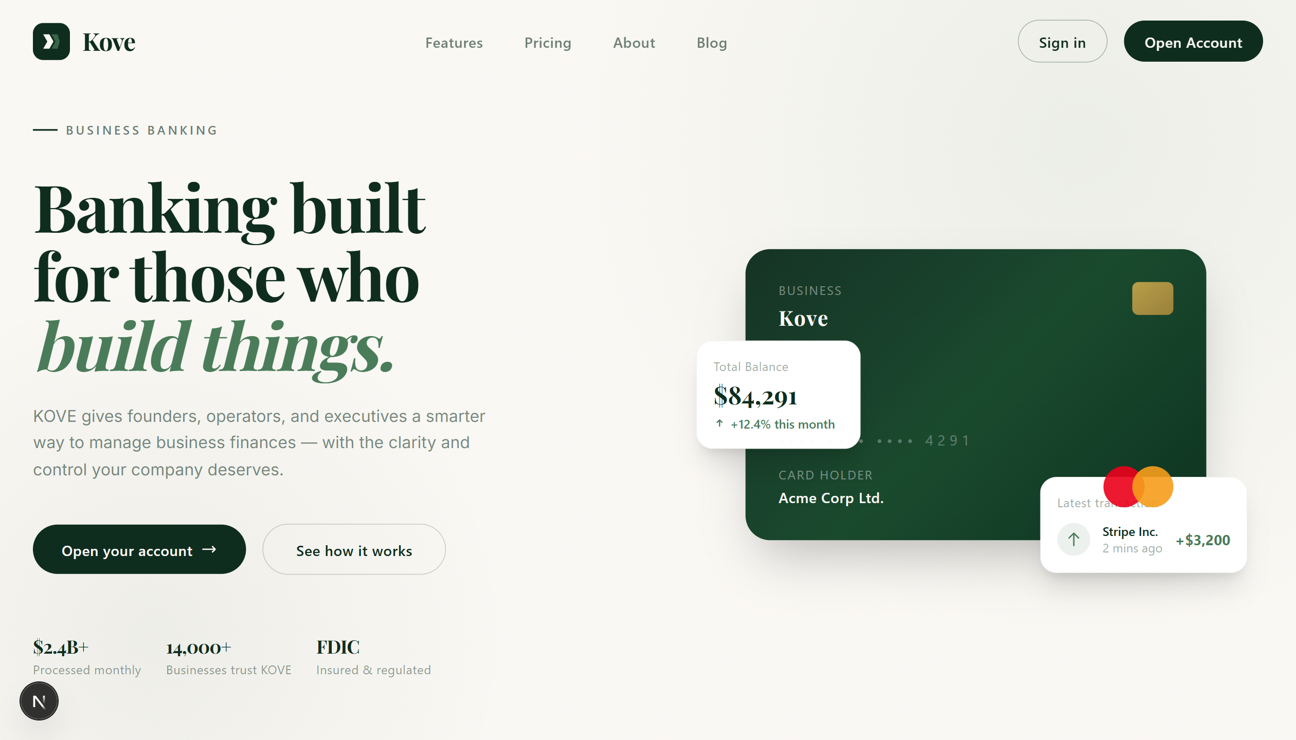 Elegant fintech landing page with warm, premium aesthetic. Features custom card designs, sophisticated animations, and a refined user experience for modern business banking. Old-money vibes with slow, elegant interactions built on Next.js 15.