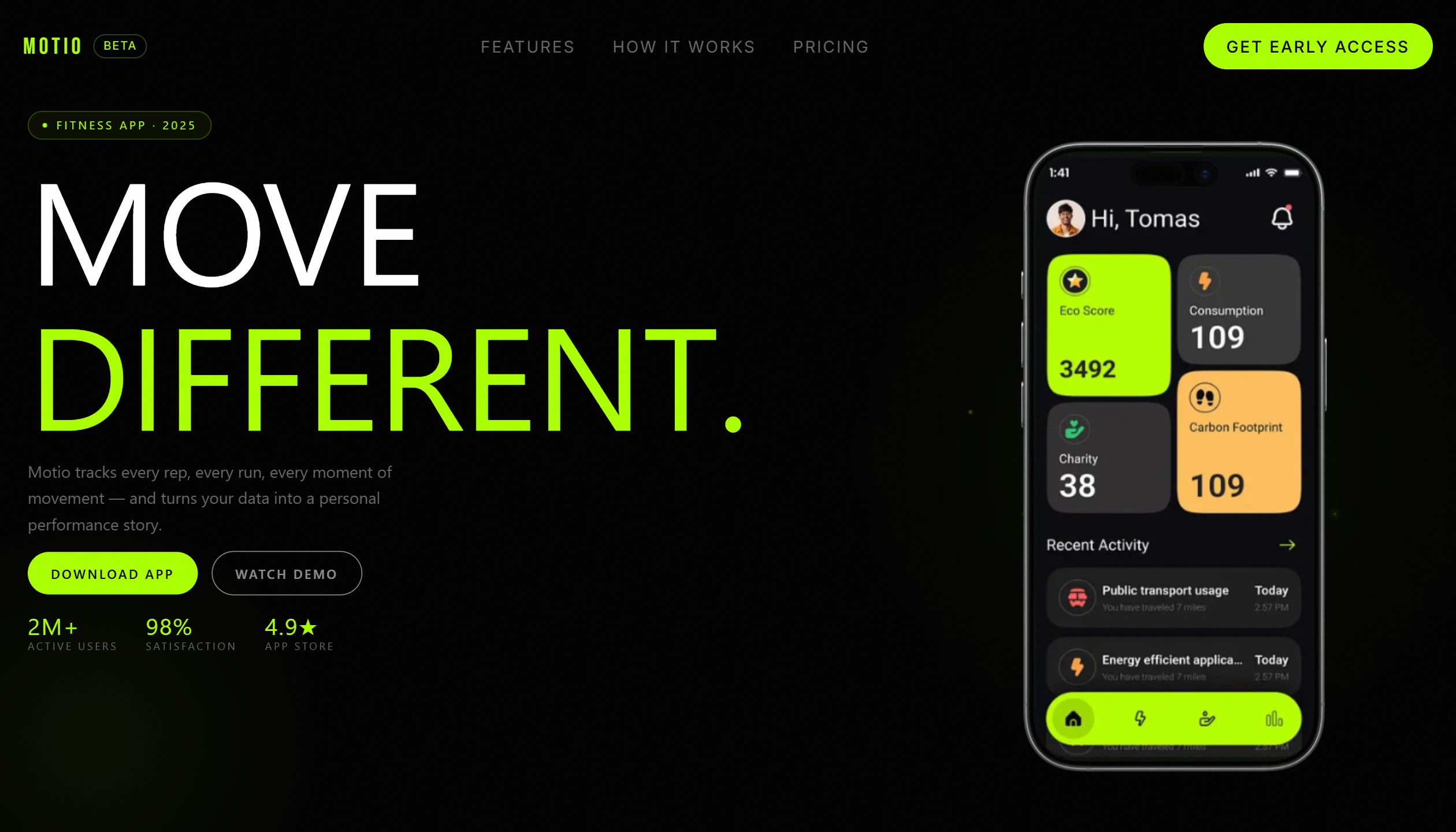 Bold, dark-mode fitness app landing page with energetic lime green accents. Features interactive phone mockups and smooth scroll animations showcasing the app experience. Built for maximum impact with aggressive typography and high-energy design.