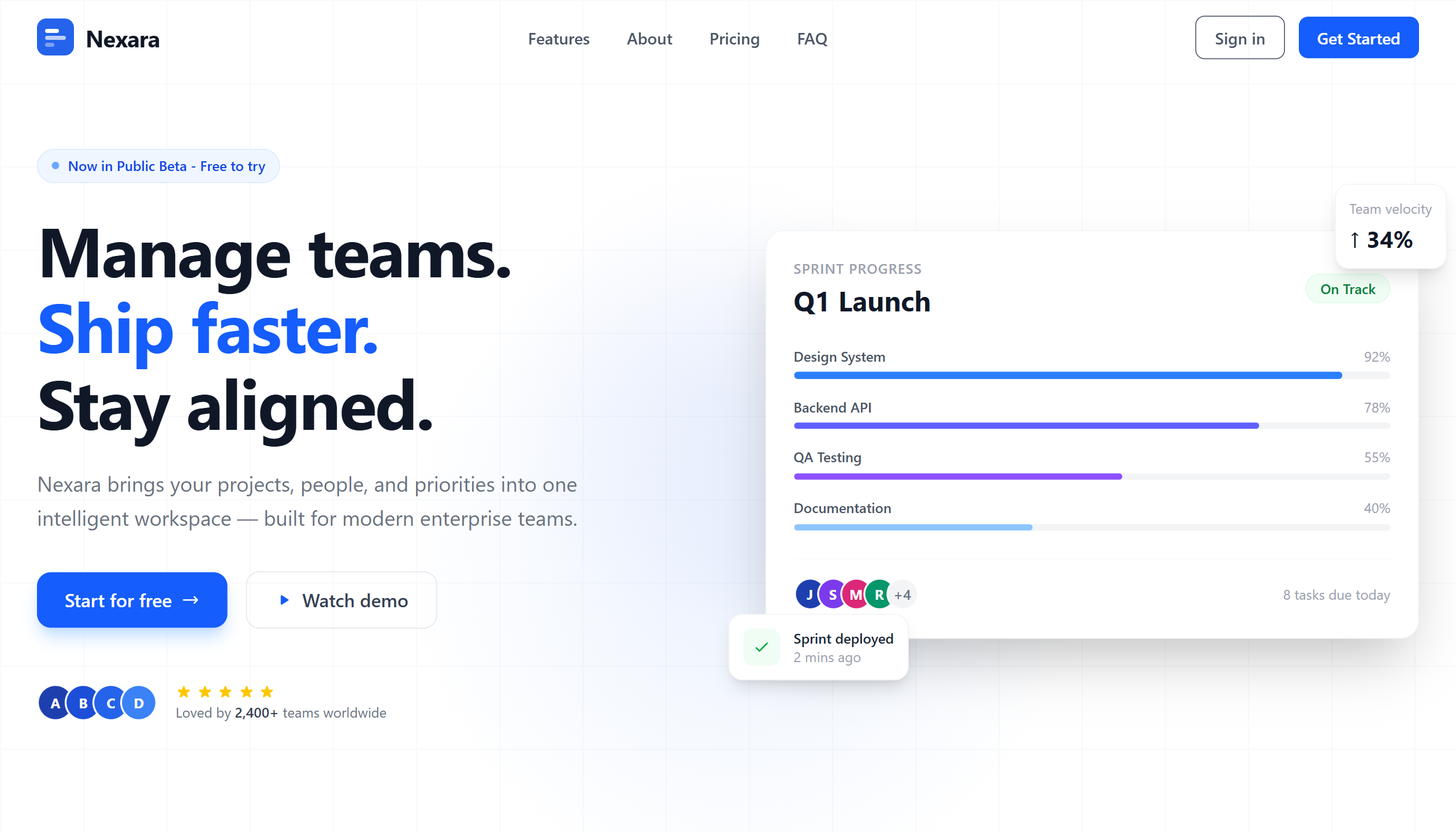 A modern SaaS platform for team collaboration with real-time dashboards, progress tracking, and seamless integrations. Built with Next.js 15, Tailwind v4, and Framer Motion featuring a clean, corporate aesthetic with grid-heavy layouts.